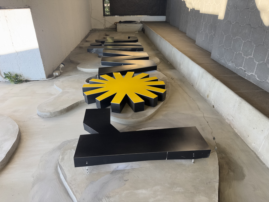 This image depicts an exterior view of a building facade in Cuernavaca, Mexico, under bright daytime lighting. A three-dimensional sign, partially visible as "re:Wit" (the 'r' and a spoked, sun-like yellow symbol are prominent), is mounted on a textured, light-grey concrete wall. The sign's letters are black, with the central symbol featuring a yellow face and black sides. The wall behind the sign exhibits subtle, raised, organic concrete patterns. A horizontal concrete ledge runs along the base of this wall, bordering a descending pathway composed of dark grey, patterned paving stones forming steps. An overhead concrete structure casts a diagonal shadow across the upper right portion of the wall. A small green plant protrudes from a vertical crack in the wall near the top right, below which two white security cameras are mounted. A dark-colored metal door is visible at the end of the pathway on the right. No people or animals are present in the scene.