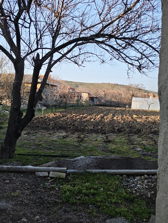 The image depicts a rural landscape located in Levka, Bulgaria, under a clear, light blue sky. In the immediate foreground, dark earth with sparse green vegetation and scattered pebbles is visible. A grey concrete pipe runs horizontally across the lower frame, with two lighter rectangular bricks positioned near its center. Directly behind the pipe, a small mound of dark soil and gravel is present, with a thinner dark hose or pipe running parallel above it. A vertical, unfinished concrete wall segment partially frames the scene on the right. The midground is dominated on the left by a large, leafless deciduous tree with dark, intricate branches. To its right and extending across the majority of the midground is a field of dark, recently tilled or cultivated earth. Beyond this field, a cluster of rural buildings with reddish-brown tile roofs and stone or timber facades are visible, some partially obscured by bare trees. On the far right midground, a white, semi-transparent plastic tunnel greenhouse is present. The background features a low, undulating hill covered in sparse brown and green vegetation, stretching across the horizon. Faint horizontal power lines are discernible against the clear sky above the hill. No individuals are present within the scene. The entire scene is illuminated by natural daylight, with distinct light patterns on the tilled field suggesting morning or late afternoon sun.