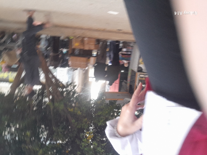 A person stands on a makeshift wooden structure, potentially working on something overhead. Sunlight streams through trees and bushes below. The foreground shows a blurred image of another person holding a white object and wearing a white shirt with red trim and a bracelet. "Galaxy A14" is visible in the upper right corner, indicating a device brand and model. The image is rotated, with the sky and person on the structure appearing above and the close-up person in the foreground below.