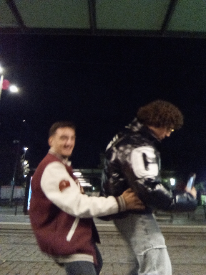 The image displays two males interacting at night in an urban setting identified as Strasbourg, France. The scene is illuminated by artificial street lighting, with an overall blurred quality indicative of low-light conditions or motion. Visible on the paved ground are parallel tram tracks. The individual on the left (Subject A) is a male with short, dark hair, smiling directly at the camera. He wears a maroon and white letterman-style jacket, featuring a maroon body, white sleeves, and a circular dark patch on his right shoulder. His right arm is wrapped around the waist of the individual on the right. The individual on the right (Subject B) is a male with dark, curly hair. He is wearing a black, shiny puffer jacket with a large white capital letter "C" prominently displayed on the back, and light blue jeans with distressed sections. Subject B is leaning forward, with his back partially turned from the camera, and his face is obscured. His left hand is positioned near his waist, appearing to hold a dark-colored smartphone. The interaction between the two individuals appears casual and possibly playful. The background shows blurred artificial lights and a dark sky, with an indistinct overhead structure, possibly a canopy or bridge element. The presence of tram tracks and general urban infrastructure is consistent with a public street in Strasbourg.