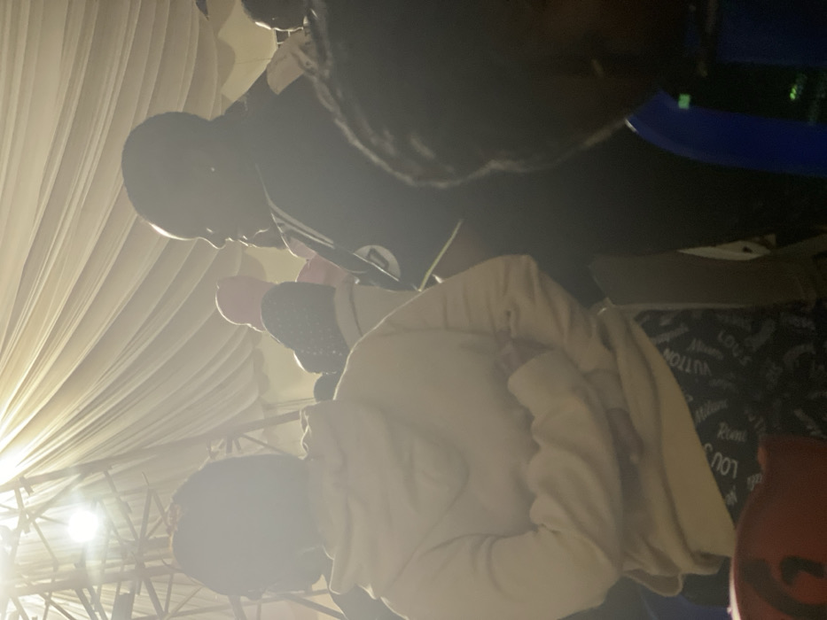A low-angle, blurry image shows a gathering under a white fabric-draped ceiling. Light streams from an unseen source, illuminating the fabric. Several people are visible, including one wearing a black Adidas shirt and another in a cream-colored hooded jacket. Balloons in pink and black are present. A patterned fabric with “Louis Vuitton” is partially visible, adding texture. The angle and light create a dynamic, if somewhat obscured, view of the social event.
