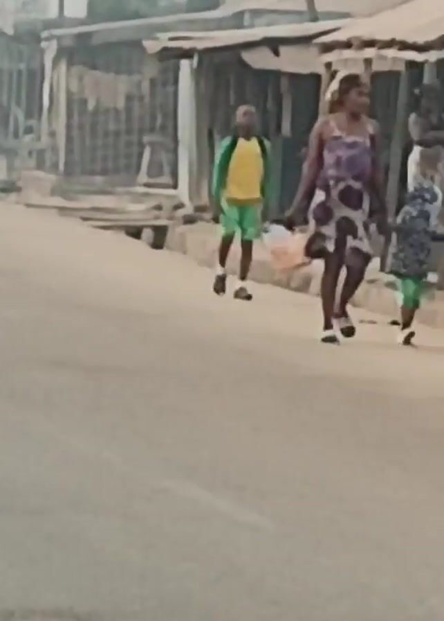 street scene in a rural or developing area. The road is paved but looks worn. There are simple, somewhat dilapidated buildings lining the street, constructed with wood and corrugated metal. A woman in a purple patterned dress walks with two young children, one in a blue patterned shirt and one in an orange and white shirt. A slightly older child in a yellow shirt and green shorts walks ahead of them. In the background, a man in a white shirt walks in the same direction as the woman and children. A man on a motorcycle passes in the opposite direction. The light suggests it is early morning or late afternoon, with a hazy or muted atmosphere. The overall impression is of a community with limited resources in a relatively undeveloped setting.