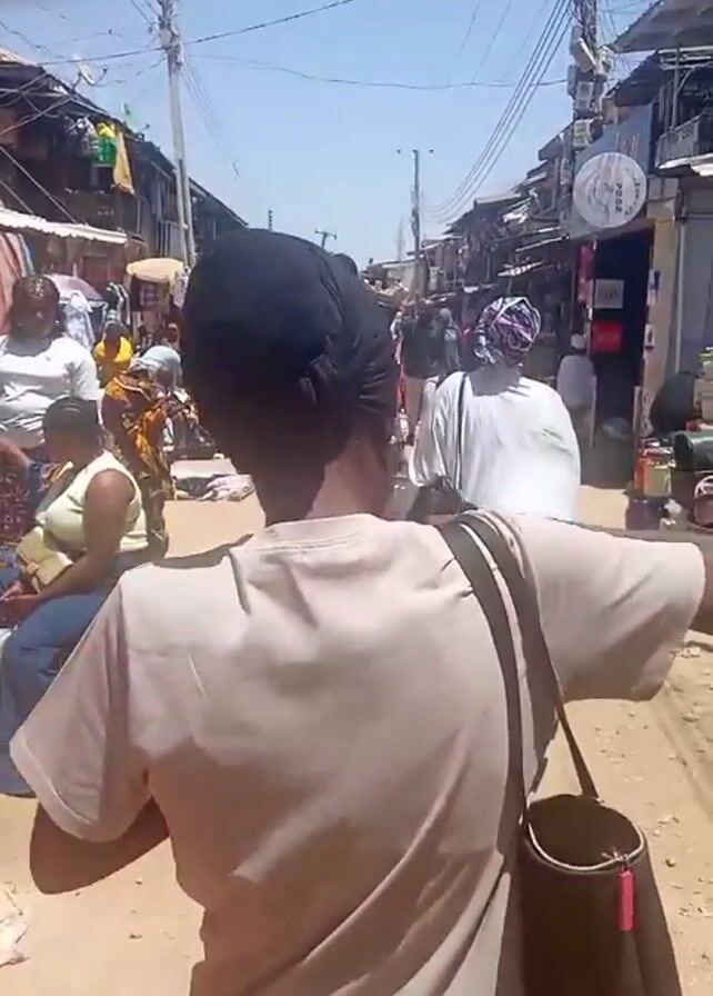 person walking down a busy street in a market setting