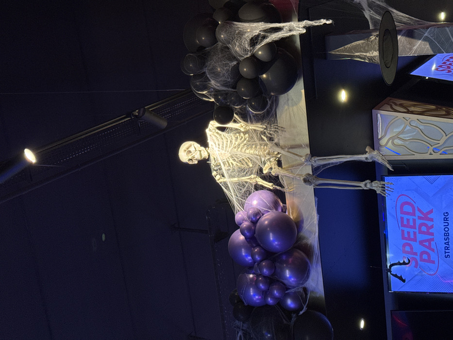 The image depicts a darkly lit interior scene within an entertainment venue in Reichstett, France. A life-sized, articulated skeletal prop is prominently displayed, seated on a raised, light-colored ledge, with its bony legs dangling downwards. The skeleton is draped with extensive artificial white cobwebs and is illuminated by an overhead spotlight from the upper left. To the left of the skeleton, a cluster of purple balloons, varying in size, is attached to the ledge and entwined with artificial cobwebs. To the right, a larger formation of black balloons, also covered in cobwebs, extends along the ledge and downwards. The ceiling is black, featuring exposed metal track lighting fixtures. Below the decorated ledge, a large, rectangular digital display screen is visible, illuminated with a blue and white gradient background. The screen displays "SPEED PARK" in pink lettering above "STRASBOURG" in white. To the immediate right of this screen, a decorative panel featuring a swirling, light-colored pattern on a darker background is partially visible. Further right, a dark, wide-brimmed hat, consistent with a witch's hat, hangs partially visible, also draped in cobwebs. No human figures are present in the frame.