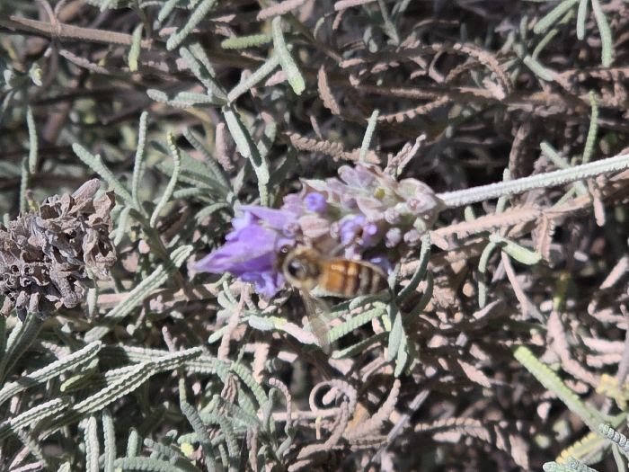 A European honey bee is positioned head-first on a purple lavender flower spike in the city of Reta, Argentina. The bee exhibits an abdomen with alternating dark brown and amber stripes; its wings are slightly blurred. The lavender plant features grayish-green, narrow leaves. A dried, brownish lavender flower head is visible in the background foliage. The environment is outdoors, under natural light, with the bee and its immediate floral substrate in sharp focus against a blurred background.