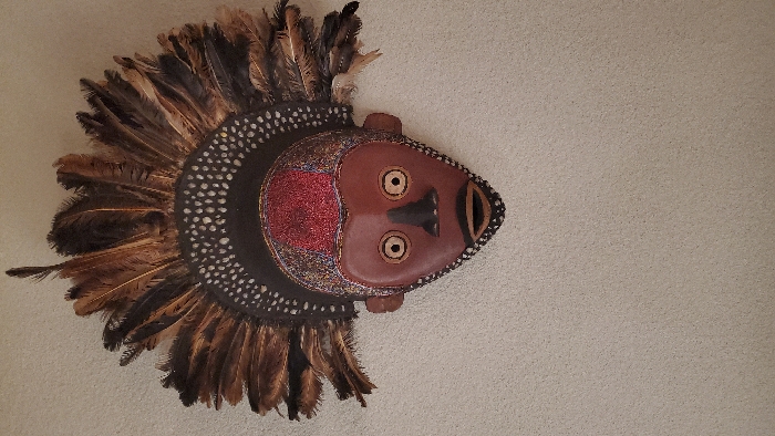- "A face mask with feathers is displayed on a beige background" by FM-s8KUF3, licensed under CC BY 4.0