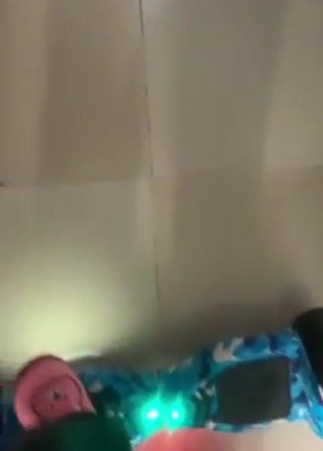person standing on a blue camouflage hoverboard with green and red lights. The person is wearing pink socks with a cartoon face and dark green pants. The floor is light beige tiles. The camera angle is looking down. The video is slightly shaky.