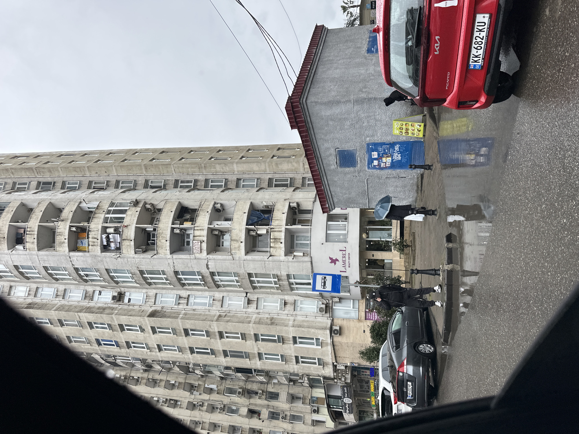 The image depicts a street scene in Batumi, Georgia, captured from inside a vehicle, possibly a car. A towering, Soviet-era apartment building dominates the left side of the frame. Its façade is characterized by rows of uniform windows and balconies. A sign reading "LAMEREL BEAUTY CENTER" is affixed to the building's lower floors, along with a bus stop sign. Adjacent to the building is a grey building with a red roof and various signage, including one that appears to offer menus. A red Kia Picanto is parked on the right side, and its license plate reads "KK-682-KU". The wet street surface reflects the surrounding buildings and cars. People are seen walking along the sidewalk, one holding an umbrella. Other parked cars, including a grey sedan with the license plate "NW-652-NR," are also visible along the roadside. The sky is overcast, indicating rainy or cloudy weather.