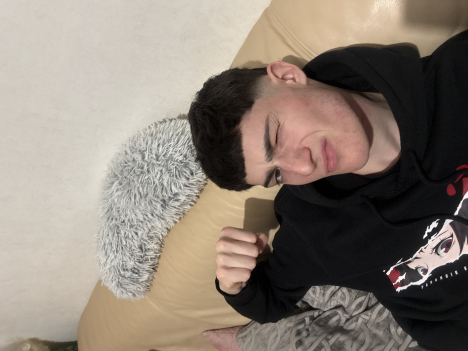 A young man with short, dark hair and a defined hairline lies on a tan couch next to a fluffy grey pillow. He wears a black hoodie with an anime-style graphic on the front. His face is angled slightly, with one eye squinted shut and a wry expression. He's clenching one fist, positioned towards the camera. The background is a plain white wall. A patterned blanket is beneath him.
