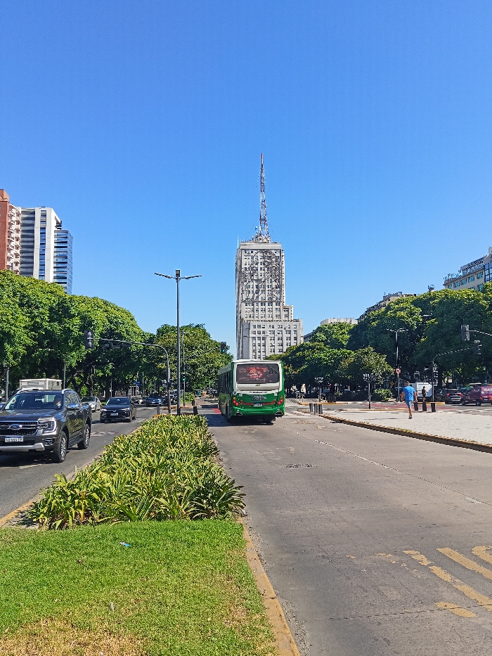 An urban scene presents a wide street divided by a green median. On one side, a gray SUV and other cars travel the road, while a green bus occupies the opposite lane. Sidewalks are lined with trees and buildings, culminating in a tall building with an antenna against a clear blue sky. A person is seen walking on the sidewalk, adding a human element to the cityscape.