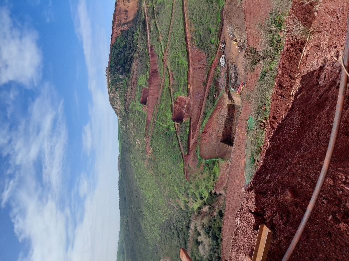 The image depicts an extensive outdoor earthworks site in Fdalate, Morocco, viewed from an elevated perspective. The foreground features a steep slope of reddish-brown soil, with a metallic pipe or bar running horizontally at the bottom and a U-shaped metal beam partially visible on the upper left. The midground reveals a large, terraced landscape characterized by multiple layers of reddish-brown excavated earth cut into green, vegetated hillsides. Within these terraced areas, several distinct excavation zones are visible, some featuring green netting. In the lower midground excavation, a construction site is evident, containing at least one yellow excavator, a red truck, piles of white debris, and other machinery, with areas of standing water or mud. The background consists of rolling green hills, some with dense tree cover, under a bright blue sky with scattered white clouds. The summit of the main hill on the right exhibits further earth disturbance and faint structures. No individuals are visible.