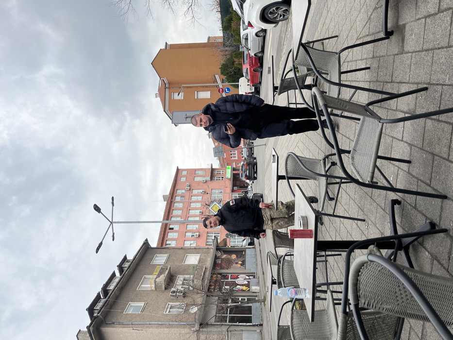 The scene depicts an outdoor cafe terrace on a paved sidewalk in Plovdiv, Bulgaria, located near the intersection of ul