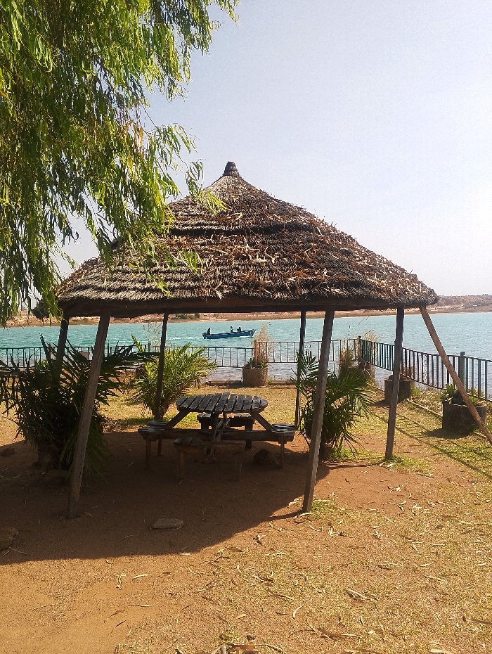 The image depicts a leisure area beside a body of water in Jos, Nigeria, under a clear, bright sky