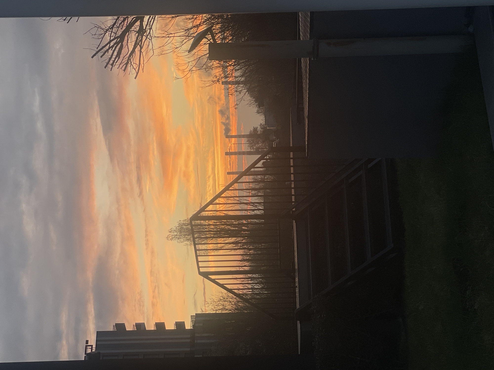The image is a vertically oriented photograph of a sunset viewed from what appears to be a building or elevated structure. The sky is filled with orange and yellow hues, with some gray clouds visible on the left. A metal staircase or railing is prominently featured in the foreground, silhouetted against the colorful sky. Below the staircase, there are building structures, and some trees. There is also green grass in the right foreground. Given the architectural style and urban context, the location may be in Sofia, Bulgaria.