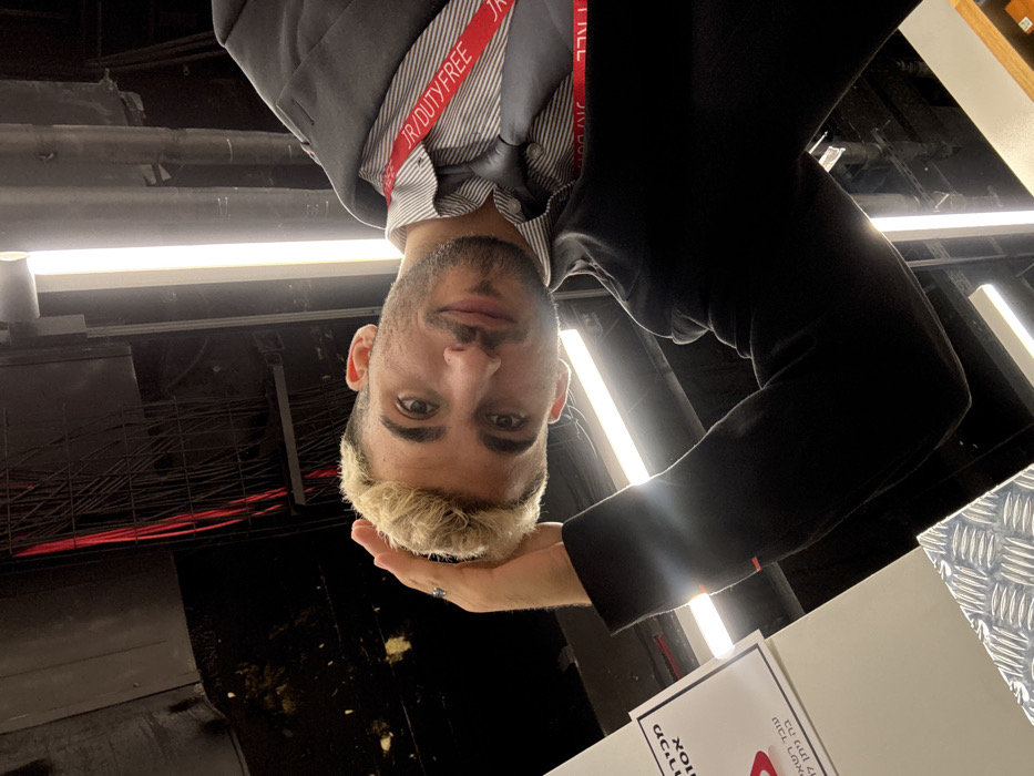 The image presents a close-up, tilted portrait of a male individual, appearing to be an employee, within an interior retail environment, likely a duty-free store in Israel. The specific location in the city of Yagel, Israel, cannot be confirmed from the visual information provided; however, a red lanyard around the man's neck reads "JR/DUTY FREE" in white text, and a partially visible sign on the left contains Hebrew text, indicating an Israeli location. The subject is a male with light-colored, possibly bleached blonde, short hair on top and darker hair on the sides, along with a short beard and mustache. He possesses brown eyes and is looking directly at the camera with a slight smile. His right hand is raised, with fingers touching the top of his head, and a ring is visible on his right ring finger. He is dressed in a light-colored, striped button-down shirt, a dark tie, and a dark jacket or blazer. The background features an exposed dark ceiling with visible wiring, some of which is red. Overhead, bright vertical linear light fixtures illuminate the scene. To the left, a white sign with black Hebrew text is partially visible, below which a metallic, textured surface (possibly diamond plate) can be seen. To the far right, a brown-toned object or surface is partially visible. The image is taken from a slightly upward angle, giving it a selfie-like perspective.