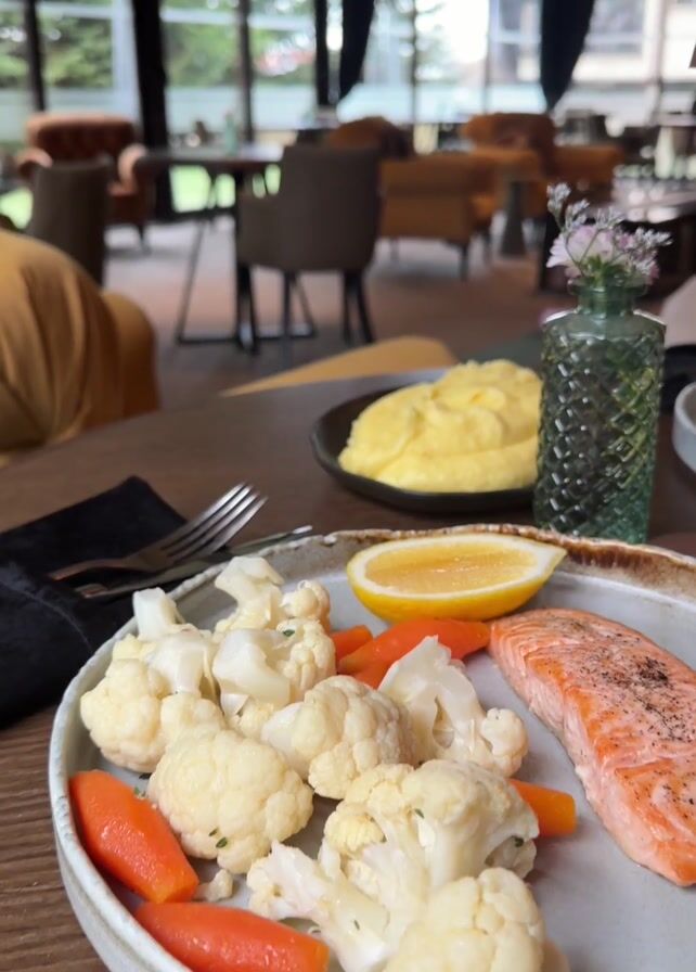 set table in a restaurant. A plate in the foreground features a cooked salmon fillet, boiled cauliflower florets, and carrot pieces, with a lemon wedge. Another plate holds mashed potatoes. A small green textured vase with tiny flowers and a brown lamp also sit on the table. The restaurant has a relaxed ambiance with comfortable seating visible through the large windows. A small bowl of sauce is placed next to another plate with salmon. Silverware and napkins are on the table. A phone is also visible on the table.
