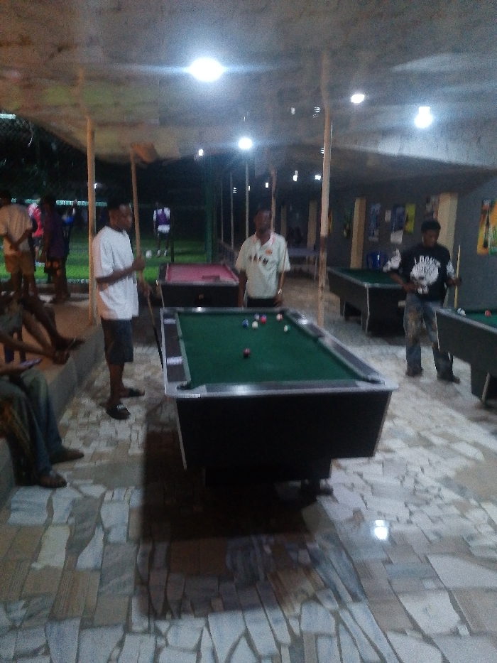 Several people are gathered under an outdoor covered area, seemingly a recreation space. A group is playing pool on multiple tables. One table has a green felt surface with billiard balls scattered on it. Another table has a pink surface. More individuals are on the lawn in the background, suggesting a soccer or football game, and the area is well-lit by overhead lights. The ground is covered in a tiled pattern.