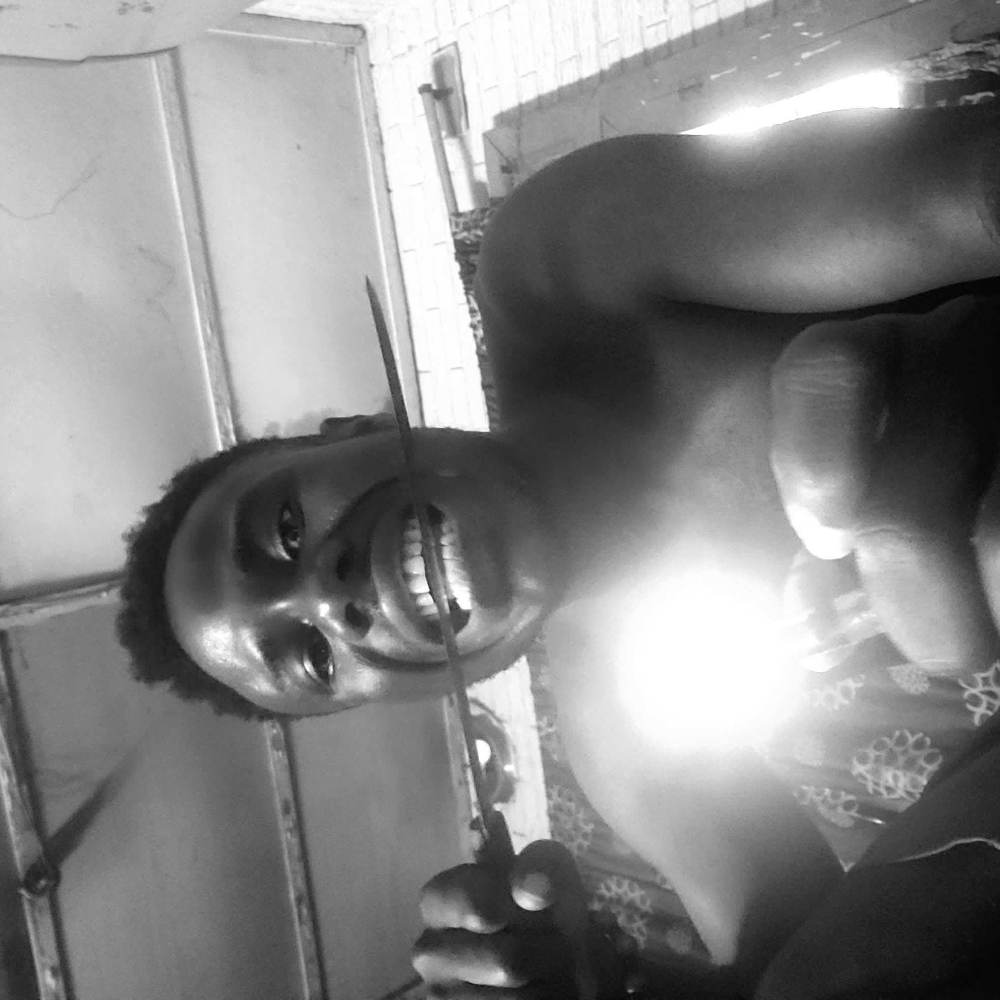 An interior, low-angle, black and white photograph depicts an adult male in a residential setting within Narayi, Nigeria. The subject, a Black male with short dark hair, is positioned in the foreground, appearing shirtless or partially clothed, exposing his upper torso. He is actively biting the blade of a slender, metallic knife with his teeth while holding its handle with his right hand. His mouth is open, revealing his upper and lower teeth gripping the blade. His eyes are wide and directed towards the camera. A bright, localized light source, consistent with a camera flash, emanates from the lower center of the frame, causing a strong glare on the subject's chest and obscuring part of his right hand. The background includes a light-colored, possibly brick or textured, wall on the right side. The ceiling above consists of corrugated metallic sheets with visible horizontal structural supports. A patterned fabric, possibly decorative, featuring circular designs, is visible on the lower left and behind the subject's right arm.