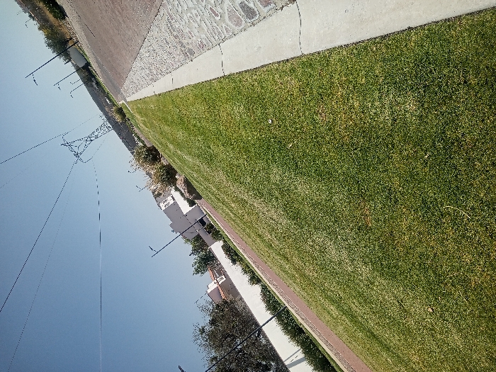 The image displays an outdoor urban or suburban scene in La Venta, Mexico, captured with a diagonal orientation. A wide, well-maintained strip of green grass, exhibiting minor yellowish discoloration in areas, dominates the foreground and mid-ground. To the immediate right of the grass, a concrete curb delineates a paved roadway or path constructed from reddish-brown interlocking pavers. Parallel to the grass on the left side, a narrower reddish-brown path is visible, bordered by a low white wall and green shrubs. In the mid-ground on the left, several white-walled structures with reddish-brown roofs are partially visible behind vegetation. Multiple dark-colored lampposts are spaced along the paved areas. A prominent metal lattice power transmission tower stands in the upper right background, from which numerous power lines extend horizontally across a clear blue sky. No individuals, animals, or vehicles are present.