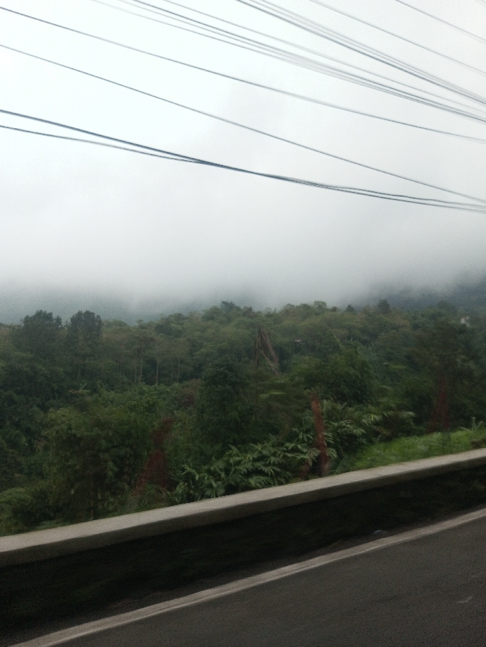 The image displays an overcast, misty, and densely vegetated landscape, identified as being in Jabalpur, India. The upper third of the frame shows a light grey sky obscured by fog or low clouds, across which several dark, parallel utility lines run horizontally. Below the utility lines, an extensive area of lush green foliage covers undulating terrain, appearing as a thick forest or jungle. Within this vegetation, a lighter-colored, prominent feature resembling a large, broken or fallen tree trunk stands vertically in the mid-right. A reddish-brown patch of earth is visible within the green foliage, suggesting a cleared area or minor erosion. In the foreground, a light grey concrete barrier or retaining wall extends diagonally from the lower left towards the mid-right. Below this barrier, a dark asphalt road with a faint white line marking its edge is visible in the bottom right corner of the frame. No individuals, vehicles, or discernible actions are present in the scene.