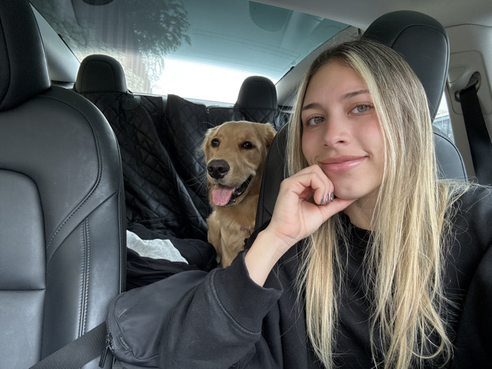 This image depicts the interior of a vehicle, located in the city of Monterrey, Mexico. On the right side of the frame, a young female with long, straight blonde hair and green eyes, wearing a black long-sleeved top, is positioned, looking directly towards the camera with a faint smile. Her right hand, displaying dark gray nail polish, is resting under her chin. To her left and slightly behind her, a golden retriever dog with light golden fur is seated on the rear bench. The dog is panting with its tongue slightly extended and is also looking towards the camera. The vehicle's interior features black leather seats, with the rear seats protected by a black quilted pet seat cover. The back of a front passenger seat is visible on the far left. Overhead, a panoramic glass roof allows natural light into the cabin, and blurred outdoor foliage is discernable through the rear window.