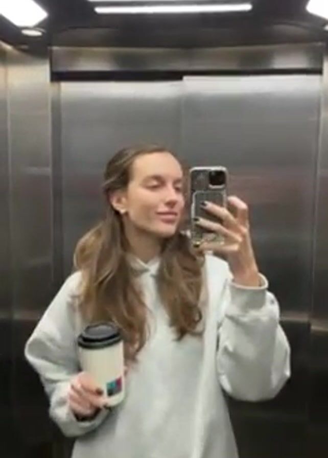 A woman in a gray hoodie and white pants is taking a selfie in an elevator. She holds a black phone in her right hand and a paper coffee cup in her left. The elevator has stainless steel walls and a light fixture of rectangular panels. She offers a second coffee cup to the camera. She smiles, then puts the second cup away. The elevator doors begin to open.