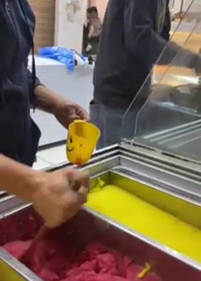 Two men stand behind a refrigerated display case with two large trays inside. One tray contains a bright yellow substance and the other a pink substance. The man on the left wears a blue jacket and uses a wooden spatula to scoop some of the pink substance into a yellow plastic cup with a smiley face on it. The man on the right wears a dark jacket and stands next to a reflective glass panel. A white refrigerator is visible in the background, along with several other people in the store.