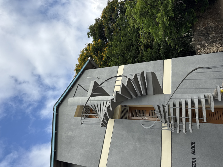 A gray building with an external spiral staircase is visible. The staircase, also gray, ascends along the side of the building. A small window is adjacent to the stairs. A vertical cream stripe adorns the building's facade. The inscription "IBERA BLOCK" is seen at the base. Lush green trees are visible above the building, contrasting with the gray architecture. A cloudy sky, partially visible, completes the composition.