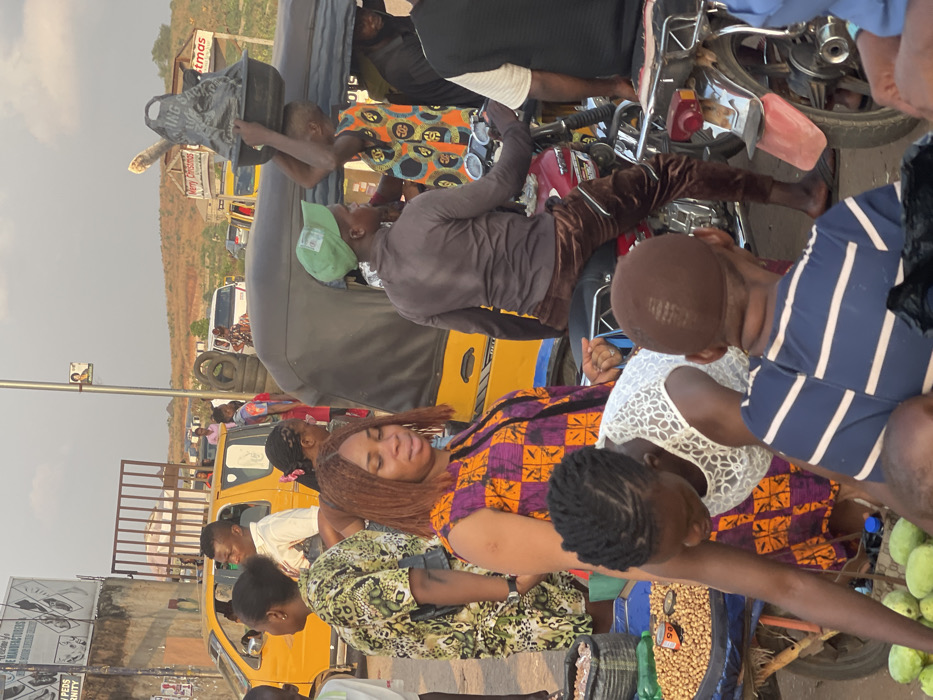 A crowded street scene features various people and vehicles. A woman in a vibrant orange and purple patterned dress sits near a cart of mangoes and peanuts, surrounded by others. An open-top vehicle (a "keke napep") is nearby. A child carries a heavy load on their head. A man in brown pants is partially visible on a red motorbike. Yellow "keke napeps" are prevalent, and a white van is further in the distance. The atmosphere suggests a bustling marketplace or transport hub in an urban area.