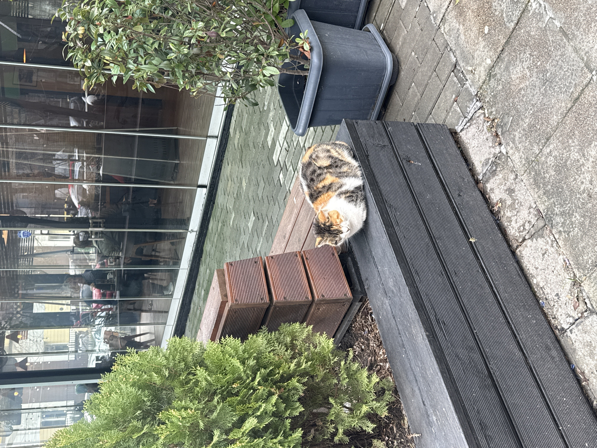 A calico cat is curled up on a bench. The bench is constructed of dark grey and brown wooden planks and sits outside a building with large glass windows reflecting the interior. Next to the bench are two planters, one grey and the other filled with greenery. A small evergreen shrub sits in the foreground. The location is Burgas, Bulgaria.