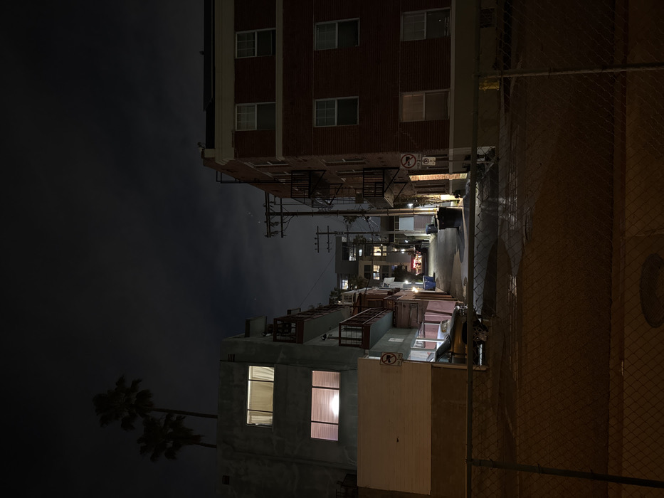 A night alleyway scene features buildings on either side. The building to the left has lighted windows and palm trees nearby. Overhead power lines crisscross the view. The building on the right is taller, made of red brick, with a fire escape. A chain-link fence borders the alley on the right. The alley leads to more lighted buildings in the distance. The sky is dark with visible clouds.