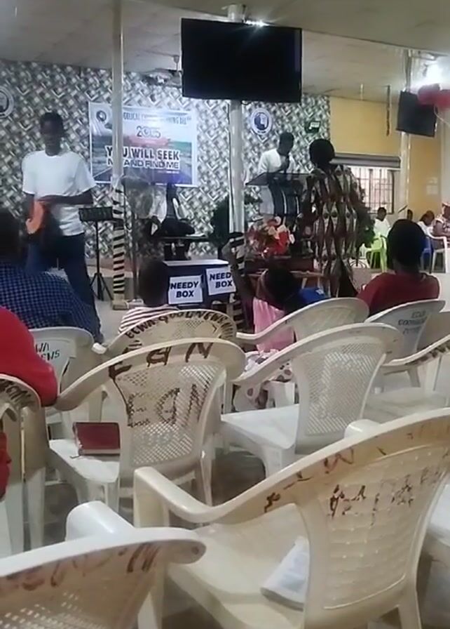 A wide-angle shot shows the inside of a church. Rows of white plastic chairs face the front where a stage is set with a pulpit, instruments, and speakers. Two black boxes labeled "NEEDY BOX" sit in front of the stage. Some people are seated in the chairs facing the stage, while others stand on or behind the stage. A man wearing a white shirt and jeans walks towards the stage. A woman in a brown patterned dress walks behind the chairs. A large black flat-screen TV is mounted on the wall above the stage. A banner behind the stage has text reading "GELICA CONVENING ALL" and "2023 YOU WILL SEEK AND FIND ME". The room has a low, patterned ceiling and large windows along the side.