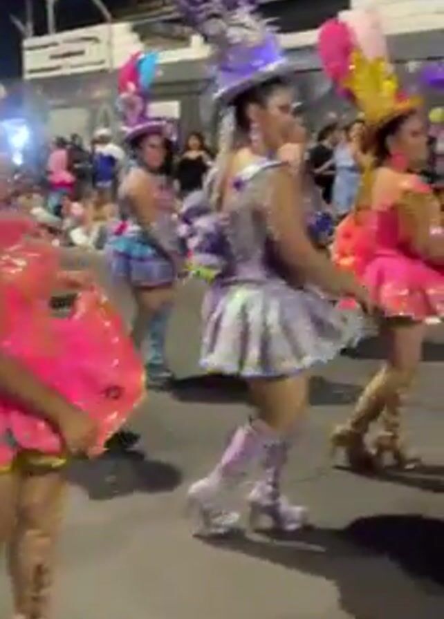 At night, a group of women in flashy dance outfits dance down the street in a parade. The women are wearing elaborate, sequined, sparkling, multi-colored costumes consisting of short skirts, tall boots, and tall hats with feathers and glitter. The dancers wear makeup. Most of the outfits are pink, white and silver, or lavender. The street is dark but illuminated by streetlights. People, some recording the dancers, watch from the sides.