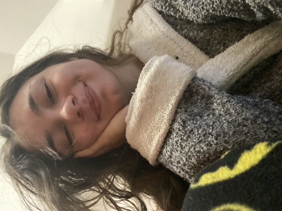 A female individual is depicted in a close-up, upward-angled shot. She has long, dark, wavy hair and fair skin. Her eyes are closed, and a slight smile is present. Her left hand supports her chin/cheek. She is wearing a grey textured robe with a light-colored, plush, sherpa-like collar and cuffs. A segment of a black and yellow patterned fabric, possibly a blanket or additional clothing, is visible on the lower left. The background is an indistinct, light-colored surface, suggesting an indoor setting. The scene occurs in Bouxwiller, France.
