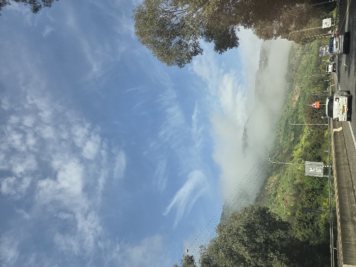 An outdoor, eye-level photograph captures a multi-lane highway winding through a mountainous and verdant landscape within the Galil Elyon Regional Council, Israel, under a partly cloudy sky. The sky features a mix of scattered white cumulus and wispy cirrus clouds against a clear blue background. In the immediate foreground, the concrete barrier of the highway's median is visible. Several vehicles are traveling away from the viewer on the paved asphalt lanes. The most prominent vehicle is a white Citroën C3 Aircross positioned in the rightmost visible lane, displaying an Israeli license plate. Further ahead, a silver sedan and a white pickup truck are discernible on the road. To the left of the highway, lush green trees and dense vegetation cover the slopes of a prominent mountain. The upper half of this mountain, along with distant peaks, is enveloped in a thick layer of white mist or low-lying clouds. Utility lines, possibly power or communication cables, are strung diagonally across the mid-left portion of the image, ascending towards the mountain, with several red-orange spherical markers attached. A streetlamp and a road sign, partially obscured, are also visible on the left side of the road. To the right of the highway, tall, leafy green trees line the roadside, obscuring the view beyond. Another streetlamp is visible among the trees on this side. No individuals are clearly identifiable.