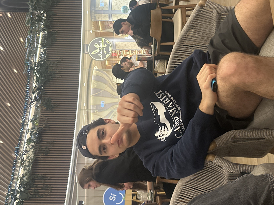 A young man in a dark blue Camp Marist sweatshirt and baseball cap sits in a woven chair, giving a thumbs-down gesture. He is indoors in a public space with a restaurant or cafe in the background, indicated by a sign in the background. Other people are visible in the background. The setting appears to be a food court or common area. The image is rotated vertically.