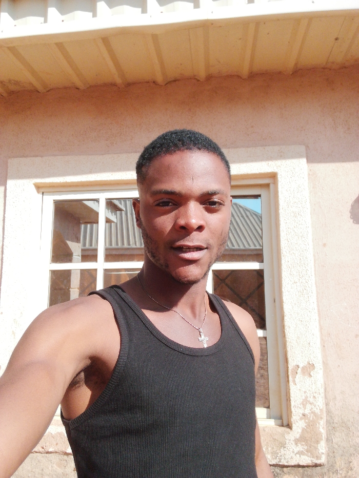A young adult male is captured in a close-up outdoor portrait in the city of Bahit, Nigeria
