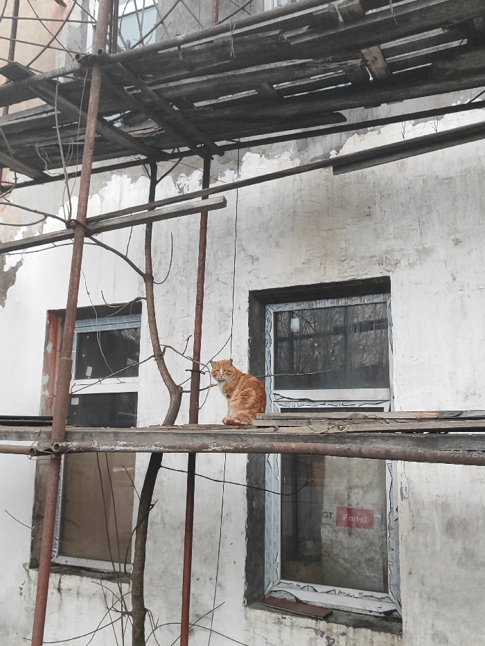 The scene depicts an exterior view of a multi-story building featuring extensive scaffolding. An orange tabby cat with amber eyes sits on a horizontal wooden plank of the scaffolding in the mid-ground, turned three-quarters right, looking towards the viewer. The scaffolding consists of rusty metal poles and weathered wooden planks, spanning the width of the frame and extending vertically. The building's facade is white to off-white, exhibiting widespread peeling paint, discoloration, and signs of decay. Two rectangular windows with dark frames are visible in the building's mid-section; the lower right window reflects a red "GT Panel" sign. A bare tree or large branch, devoid of leaves, grows vertically through the scaffolding on the left side of the frame, near the cat. The environment suggests an urban setting, possibly an area of construction or neglect. The lighting is dull, indicative of an overcast sky. The location is Unknown, Unknown.