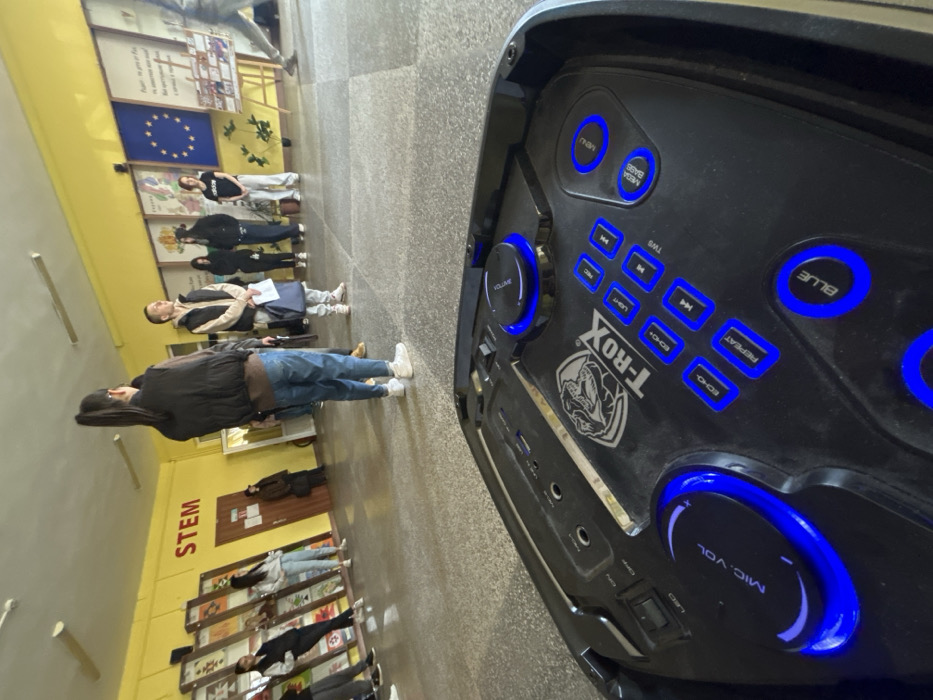 The scene depicts an indoor public space, likely an educational facility, situated in Kardzhali, Bulgaria. The floor is composed of large, light grey and darker grey square tiles, and the walls are painted a solid yellow. Overhead, ceiling-mounted fluorescent light fixtures provide illumination. In the immediate foreground, a black, robust 'T-ROX' brand audio device is present, angled towards the viewer. Its control panel features numerous circular and rectangular buttons and knobs, all illuminated with blue light. Key labels visible include 'MIC. VOL', 'VOLUME', 'REC', 'LIGHT', 'ECHO+', 'ECHO-', 'REPEAT', 'TWS', 'MEGA BASS', 'MENU', and 'BLUE'. The device's surface shows minor scuffing and dust accumulation. Approximately 12 to 15 individuals, primarily young adults or teenagers, are standing in the midground and background. One central figure, with dark hair styled in a high ponytail, wears a dark puffer vest over a brown long-sleeved shirt, blue jeans, and white sneakers, with their back partially to the camera. To their right, a male individual wears a beige padded vest over a light-colored long-sleeved shirt, dark pants, and white sneakers, holding a stack of white papers. Other individuals are distributed throughout the background, dressed in casual attire such as jeans, hoodies, and jackets, standing and observing the general area. The background environment includes various wall displays. On the left wall, several tall, narrow framed exhibits with patterned designs are visible. The red capital letters spelling 'STEM' are affixed above a brown wooden door. On the right wall, a large blue flag adorned with yellow stars, identifiable as the European Union flag, is displayed alongside multiple posters, charts, and two potted plants placed on the floor. An easel supporting an upright display board stands further to the right.