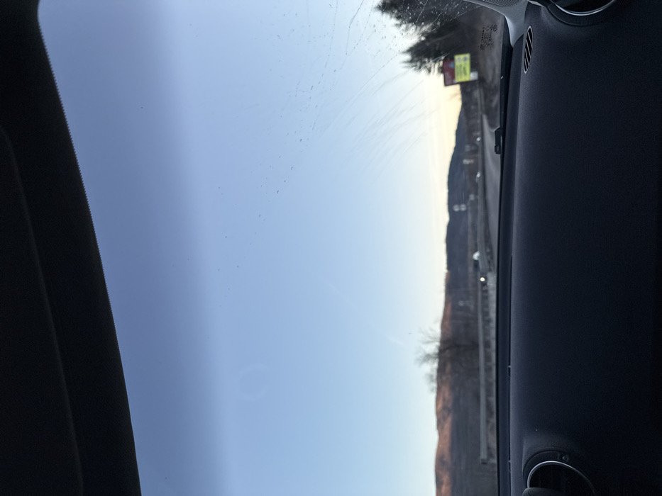 The image captures a view from the interior of a vehicle, looking forward through the windshield towards a road in Marchaevo, Bulgaria, during daylight hours, likely early morning or late afternoon given the clear sky and lighting. The upper portion of the frame is dominated by a clear, light blue sky. The windshield exhibits noticeable dust accumulation and streaks, particularly on the right side, suggesting water residue or wiper action. A dark, padded vehicle dashboard occupies the lower portion of the frame, with a circular air vent visible on the far left and part of the A-pillar on the right. Beyond the windshield, a multi-lane paved road curves gently towards the right, with several vehicles visible in the distance as blurred shapes or headlights. A gray concrete barrier or bridge structure runs alongside the road. To the right of the road, a dense cluster of dark evergreen trees is present, partially obscuring a red and yellow billboard. In the background, a range of rolling hills or mountains, appearing dark brown and sparsely vegetated, stretches across the horizon under the bright sky. No individuals are directly visible.