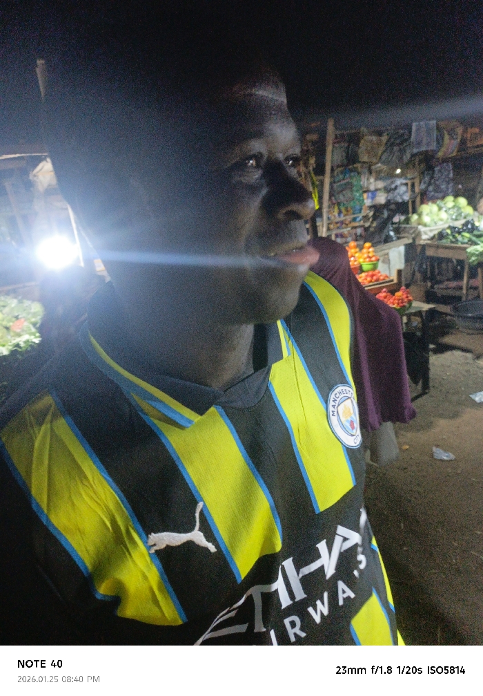 A person wearing a black Manchester City soccer jersey with yellow and light blue stripes. The Puma logo and "Etihad Airways" are visible on the jersey. The photo appears to be taken outdoors at night, possibly at a market, with produce stands in the background. The camera settings are 23mm f/1.8, 1/20s shutter speed, and ISO 5814. The photo was taken on January 25, 2026, at 8:40 PM.