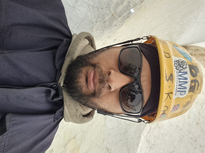 An individual is depicted in a close-up, head-and-shoulders portrait, located in Maasvlakte, Rotterdam, Netherlands. The subject, an adult male, wears a worn yellow hard hat with various markings including "BG", "MMP" (featuring a gear logo), "S.K", and a small Union Jack flag sticker. Dark, rectangular sunglasses obscure the eyes, displaying reflections of the immediate environment. A dark beard and mustache are visible. A black head covering is worn beneath the hard hat. The subject is dressed in a grey hooded sweatshirt layered under a dark blue collared work jacket. The individual faces the camera directly with a neutral expression. The background consists of an indistinct, light-toned, textured surface, possibly a wall or tarp.