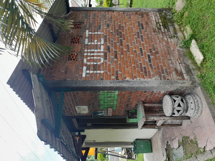 brick toilet building located at coordinates -7.442, 112.705 in Kecamatan Sidoarjo, Indonesia. The toilet has a corrugated metal roof, a concrete floor, and a single entrance door on the left side. The wall is made of red bricks, and there is a green-colored rectangular sign on the wall, with the word "TOILET" written on it in white paint. In front of the toilet, there is a small wooden stool with a stone footstool next to it. There is a green trash can in front of the toilet, and a green lawn with grass and a few trees growing around the building. The building appears to be in good condition.
