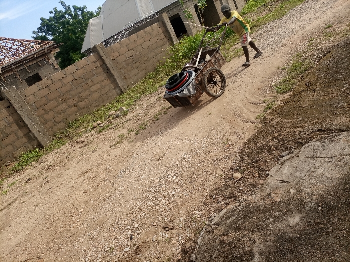 In Adankolo, Nigeria, a single male is observed pushing a two-wheeled utility cart uphill on an unpaved dirt and gravel path