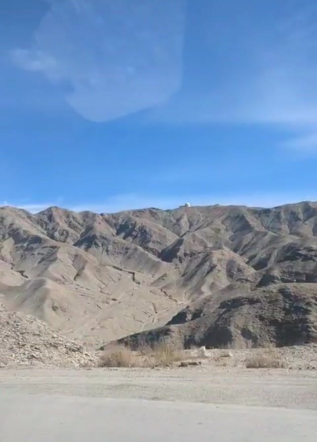 view from a moving vehicle, likely a bus or car. The camera pans across a mountain range under a bright blue sky with a few scattered clouds. The mountains are dry and mostly barren, with visible ridges and valleys. A large pile of rocks is visible in the foreground, followed by a roadside barrier painted in black and yellow. The road appears to be paved, and the landscape has a desert-like appearance.