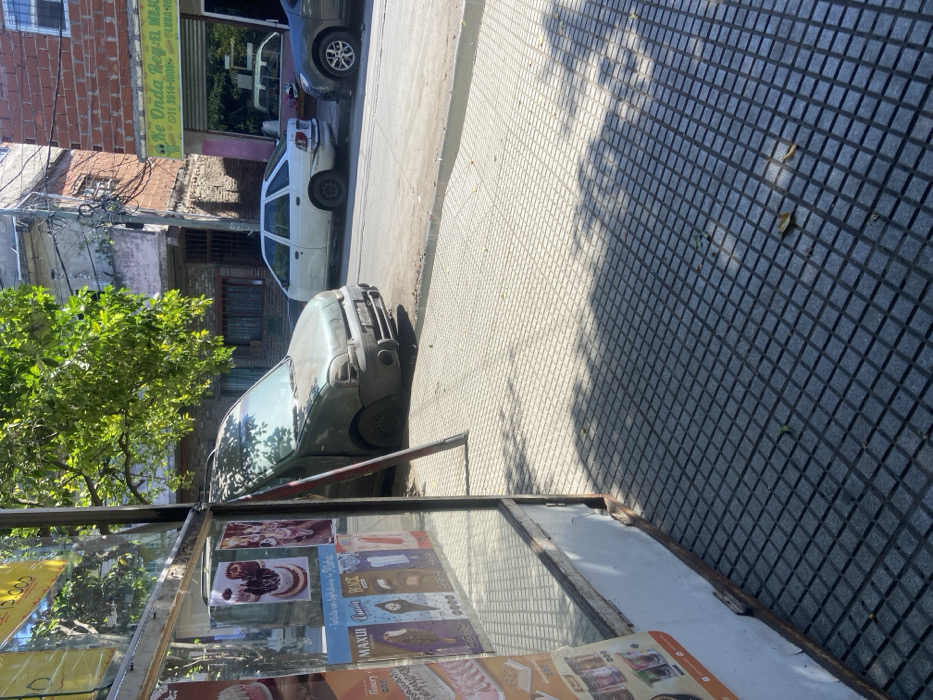 A street scene shows parked cars along the curb. A green car is closest, partially obscured by what seems to be a display case filled with promotional materials. Buildings rise on the left, including one with a storefront. Sunlight dapples the sidewalk creating shadows, and the sidewalk itself is tiled.