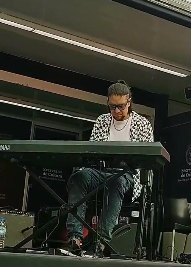 A man wearing sunglasses, a white t-shirt, and a patterned jacket is seated on a stage, playing a Yamaha keyboard. He has long hair tied back and wears jeans and dark sneakers. The keyboard stand is labeled "Secretaria de Cultura". An amplifier and a water bottle are visible on the floor to his left. A black chair and another sign for "Secretaria de Cultura" are to his right. The stage is under an awning.