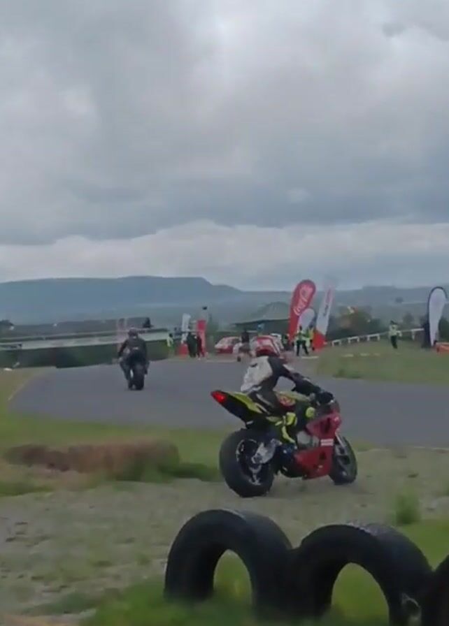 A motorcyclist, wearing a black and yellow suit and helmet, rides a red and yellow motorcycle onto a paved track. Another motorcycle follows behind, along with various people standing around the track. Coca-Cola banners and other promotional flags decorate the perimeter of the track. A hilly landscape is visible in the background under a cloudy sky. The camera perspective remains stationary throughout the video.