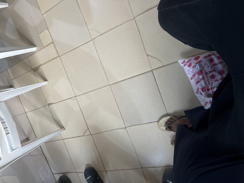 A high-angle shot captures a section of tiled flooring with white plastic chairs on the left