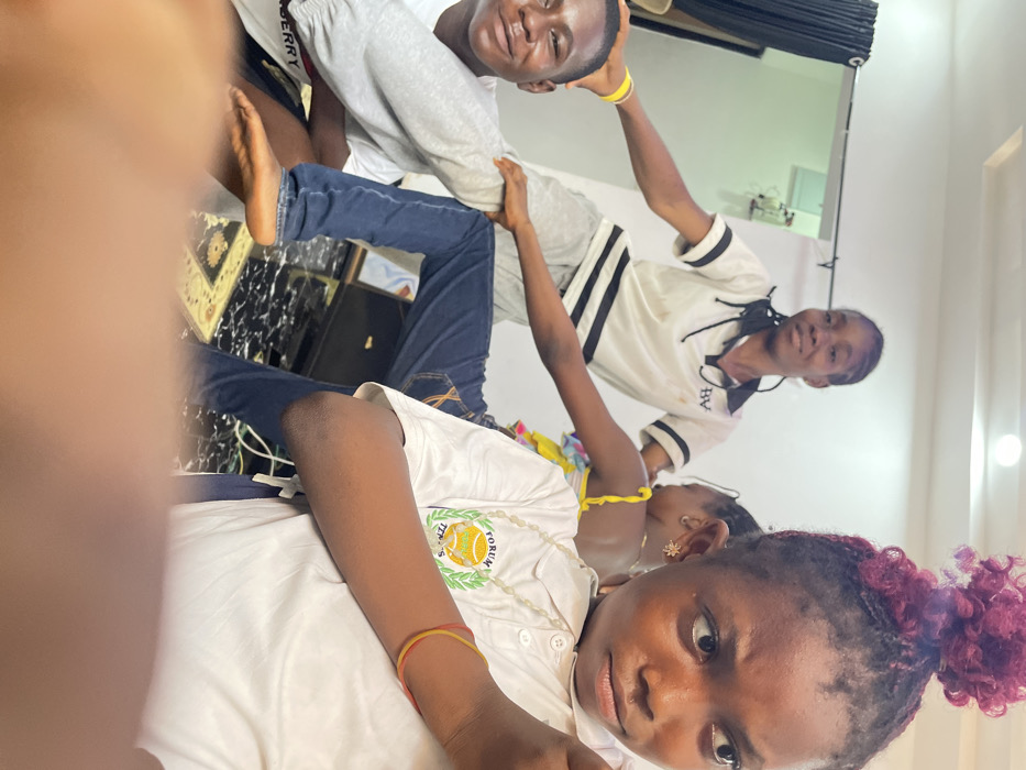 The image depicts an indoor scene in Idah, Nigeria, featuring four individuals engaged in a cooperative balancing activity